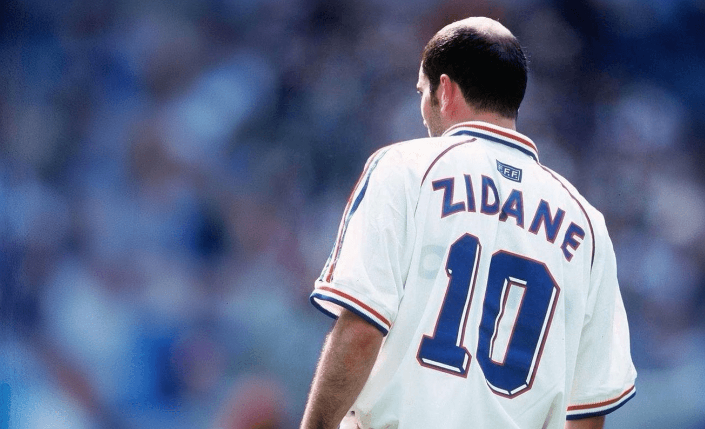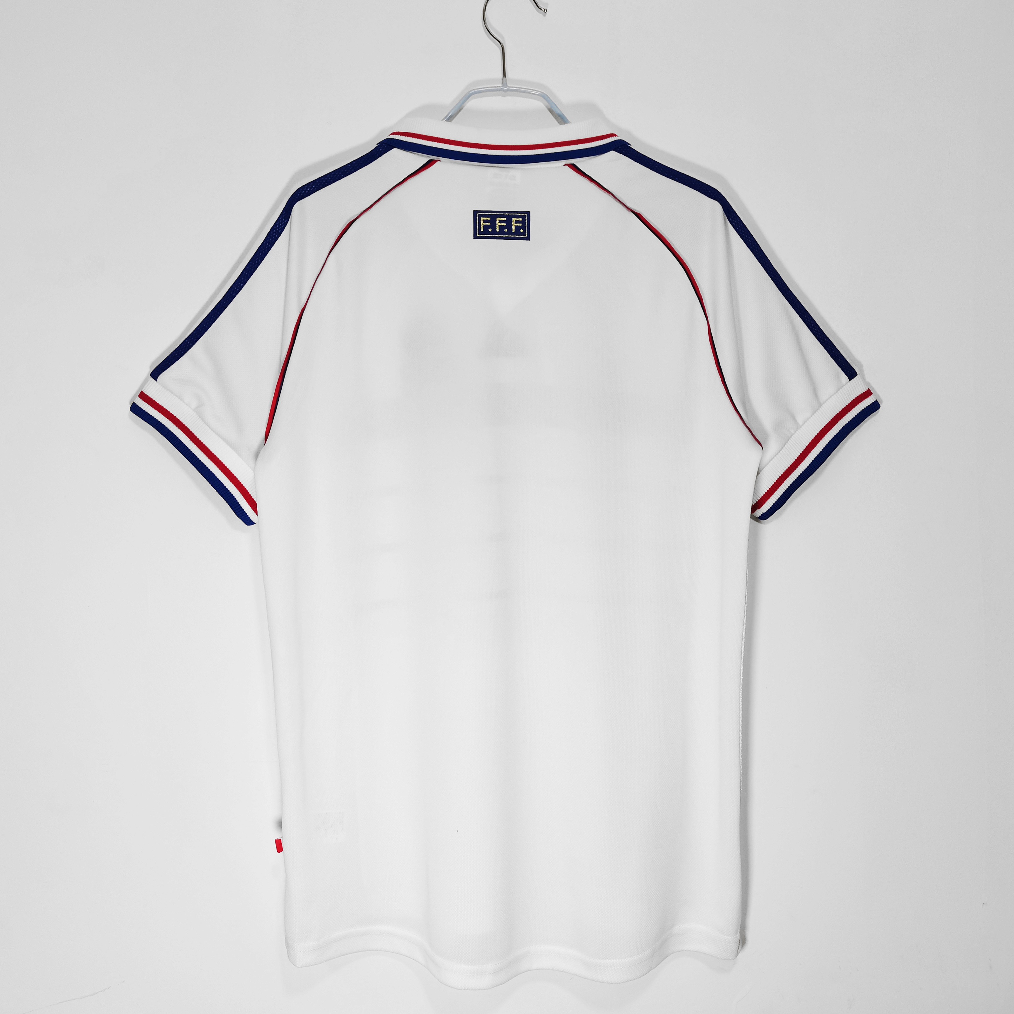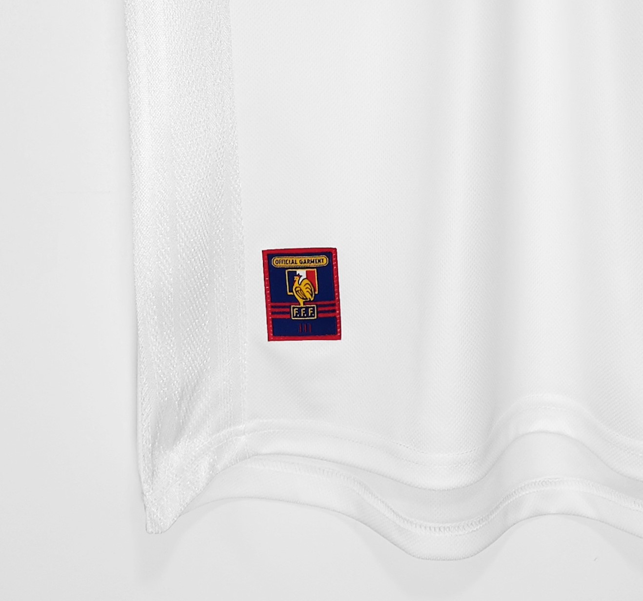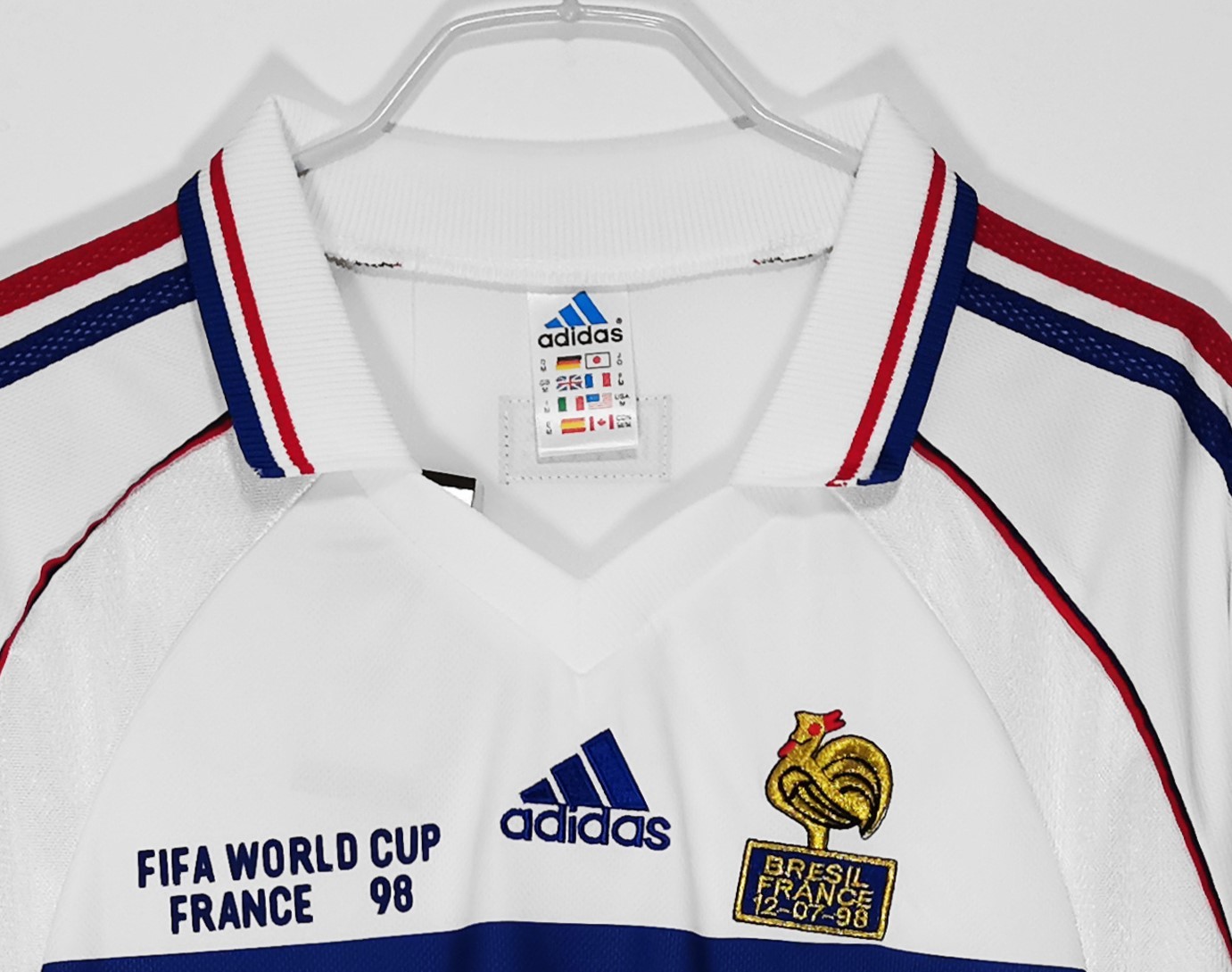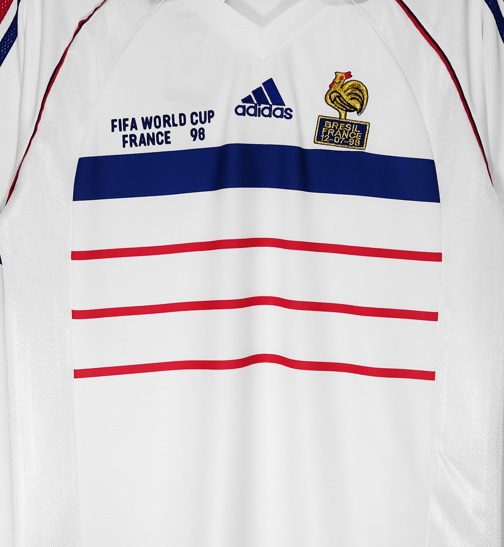 The armor of the host nation. While the blue kit is famous for the Final, this white away classic was worn during the intense group stages of the 1998 World Cup. With its horizontal red and blue stripes and the golden cockerel, it symbolizes the summer that Zinedine Zidane and France conquered the world on home soil.